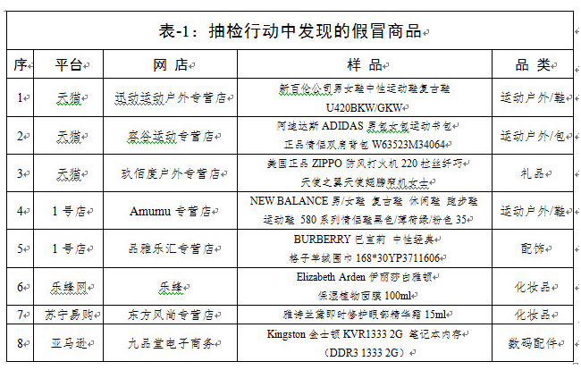 工商總局公布“雙11”期間對(duì)電商平臺(tái)促銷(xiāo)商品的抽檢結(jié)果:已確認(rèn)8批次樣品為假冒商品,天貓3個(gè),1號(hào)店2個(gè),樂(lè)蜂網(wǎng)、蘇寧易購(gòu)、亞馬遜各1個(gè);7批次樣品涉嫌假冒商品正在分析中。另有7批次樣品質(zhì)量不合格或標(biāo)簽不合法。
