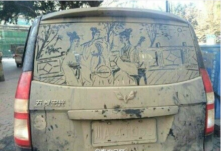 網(wǎng)友在成都偶遇一臟不溜秋的面包車!走近一看,后檔風(fēng)玻璃上畫了一副美女圖,惟妙惟肖!~你只覺得我沒錢洗車,卻不知道我也有一顆藝術(shù)的心~~只是朋友,車牌被擋住了,等會(huì)兒警察蜀黍過(guò)來(lái)……