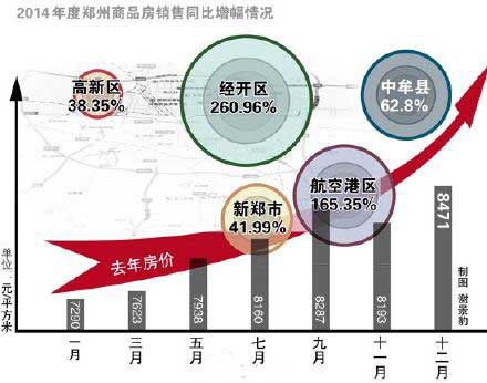 鄭州去年12月份房價達(dá)到8471元/平方米,達(dá)到歷史最高水平,相比于去年年底漲了1181元。即便如此,經(jīng)開區(qū)和航空港區(qū)商品房銷售翻倍。隨著拆遷的進(jìn)行,租房價格也一路走高,商鋪房租上漲10%,住宅房租漲幅達(dá)15%。