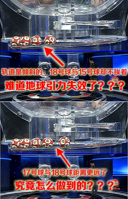 網(wǎng)友@林建章67:雙色球2015011期搖獎視頻疑有貓膩!軌道是傾斜的(左低右高),14號、4號,正常,15號就不正常了,搖搖晃晃不想與4號挨著,18號,干脆與15號不挨,17號,距離更大了……難道地球引力失效了?還是球體有問題?3分08秒,一起鑒定。