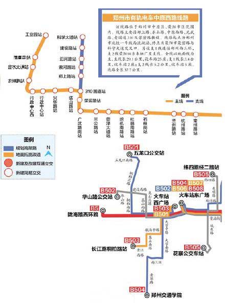 鄭州市有軌電車中原西路線路起點為地鐵一號線西流湖站,終點為滎密路與科學大道交叉口。另設支1線連接鄭州西三環(huán),支2線滎陽四方車輛廠至主線。主要沿鄭上路、樂山路、中原西路、光武路、老國道310及滎密路敷設。