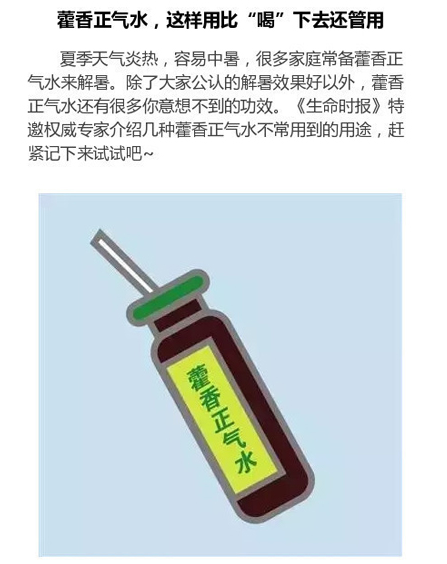 夏天炎熱,容易中暑,很多家庭常備藿香正氣水來解暑。除了解暑效果以外,藿香正氣水還有很多你意想不到的功效。外敷去暑、巧治皮膚病、解酒、預(yù)防暈車、緩解嬰兒腹瀉......