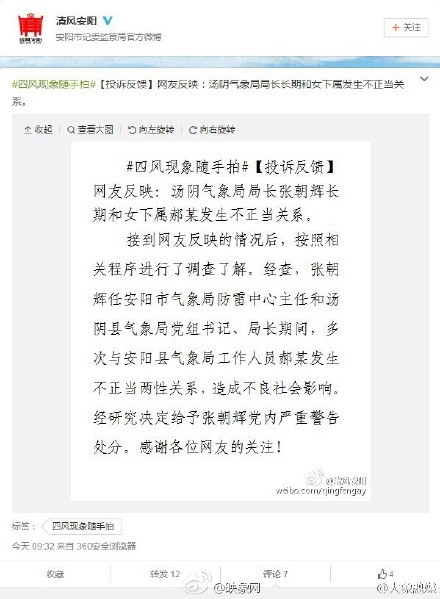 以往不少"性丑聞"官員都被查出貪腐問題。不妨順藤摸瓜,查一查張朝輝是否存在其他問題,給民眾一個(gè)交代。同時(shí),張朝輝今年初剛被任命為湯陰縣氣象局長,尚在1年試用期內(nèi)。既然出了如此影響惡劣的丑聞,組織上有必要對其任職資格和條件,重新進(jìn)行評估。