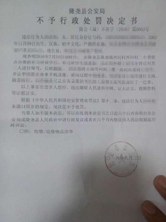 被害人家屬翻拍的一份由隆堯縣公安局對其中一名肇事學(xué)生開具的不予行政處罰決定書。7月24日下午,河北省邢臺市隆堯縣堯山中學(xué)一名初一學(xué)生,因為不愿意借錢而在補習(xí)班遭受了兩名女生長達(dá)4分鐘的辱罵、毆打,另一名學(xué)生還把整個過程用手機拍攝下來并上傳網(wǎng)絡(luò),視頻在當(dāng)?shù)乇化偪駛鞑ァ?/p>