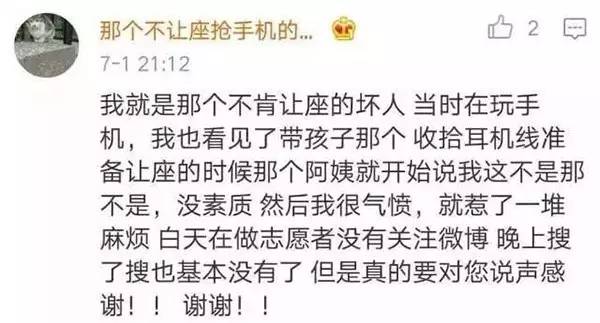 7月1日,該男子發(fā)微博稱,他原本收拾耳機(jī)準(zhǔn)備讓座的,這時大媽就開始說他這不是那不是,說得他很氣憤,就賭氣不讓了。