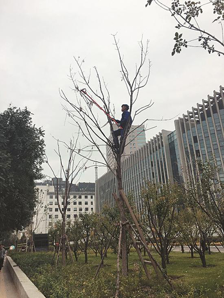 老段正在修剪的是一棵白蠟樹,是今年新栽的,5米多高,樹冠比較大,樹枝的枝杈也很多,但是樹葉很少?!靶略缘陌紫灒瑯淙~還沒長,今年修剪完,明年就長得好看了?!崩隙握f,新栽的樹一般都要在栽種處提前挖個土丘,可是因為根系被破壞了,水分吸收得少,原先的樹枝多,營養(yǎng)就不夠用。