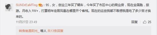 95年,創(chuàng)業(yè)三年買了輛車,今年買了市區(qū)中心的商業(yè)房,現(xiàn)在全國(guó)排,旅游。月收入一萬(wàn)+,打算明年定居鳳凰哪里開個(gè)客棧,現(xiàn)在的著寫我都不敢想我是吃了多少苦才換來的。