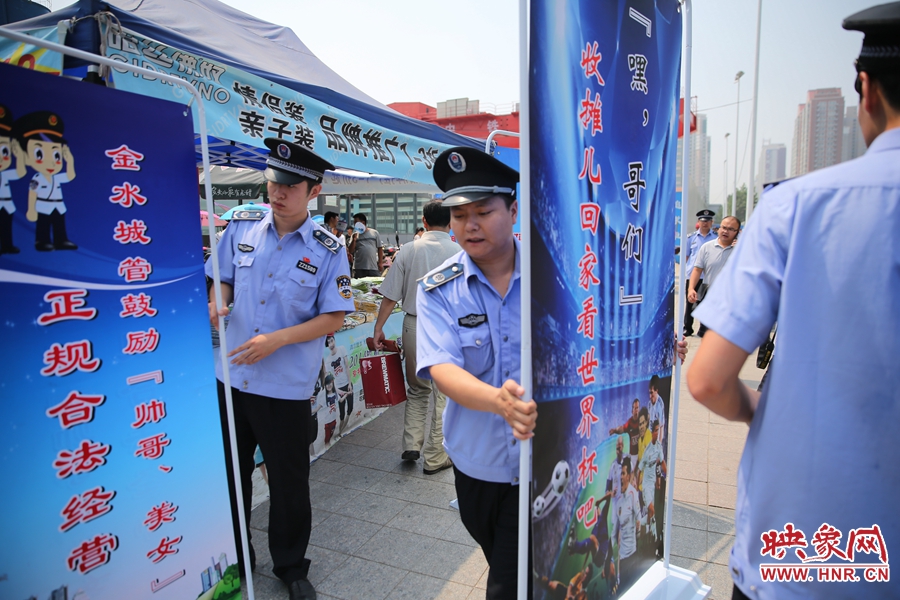 映象網(wǎng)訊 (記者 閆善良 文/圖)“你家人造(知道)嗎?”、“西班牙、英格蘭都回家了。哥們......咱也不在這添堵啦!”、“哥、姐,嫩(你們)別給這兒添堵啦?!薄ⅰ昂?,哥們!收攤兒回家看世界杯吧!”、“帥哥、美女,正規(guī)合法經(jīng)營(yíng)?!薄ⅰ敖鹚枪芨嬷?,醬紫(這樣子)不合適?!?月2日上午10時(shí)20分,鄭州市紫荊山地鐵站出入口,用網(wǎng)絡(luò)流行語寫成的十多塊宣傳板,呈弧形圍在一個(gè)占道經(jīng)營(yíng)商販的周圍,引來眾多市民圍觀。