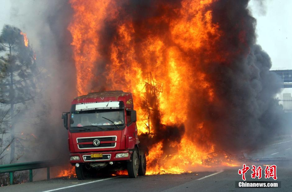 1月23日下午4時許,滬昆高速公路江西弋陽往貴溪方向593公樁(貴溪收費站附近)一輛載有133部電動車的半掛車起火,導(dǎo)致電動車被大火“吞噬”。江西貴溪消防官兵接警后迅速到場撲救,半小時后將大火撲滅。據(jù)司機(jī)稱,火災(zāi)疑因高速護(hù)坡雜草叢起火產(chǎn)生的火芯飄至半掛車,引燃包裝電動車的紙殼箱所致。中新社發(fā) 龔武 攝