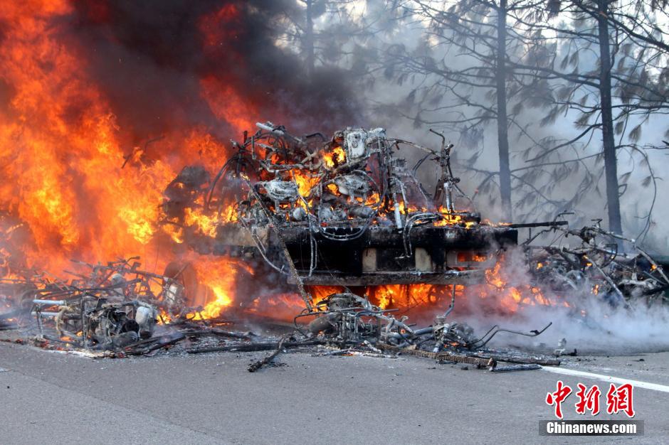 1月23日下午16時許,滬昆高速公路江西弋陽往貴溪方向593公樁(貴溪收費站附近)一輛載有133部電動車的半掛車起火,導(dǎo)致電動車被大火“吞噬”。江西貴溪消防官兵接警后迅速到場撲救,半小時后將大火撲滅。據(jù)司機(jī)稱,火災(zāi)疑因高速護(hù)坡雜草叢起火產(chǎn)生的火芯飄至半掛車,引燃包裝電動車的紙殼箱所致。中新社發(fā) 龔武 攝