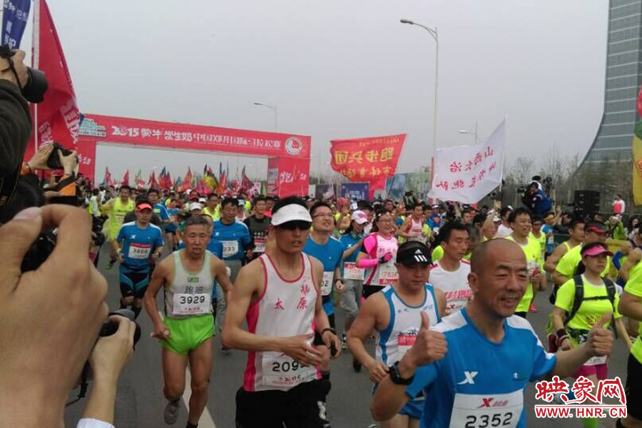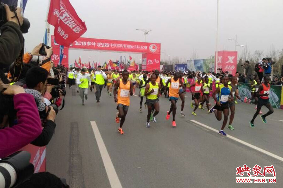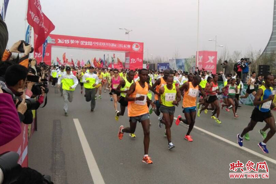 映象網(wǎng)訊(記者 駱瓊 阮海峰/文 閆善良 段晉哲/圖)3月29日上午8時30分,2015中國鄭開國際馬拉松賽在鄭東新區(qū)鳴槍開賽,來自29個國家和地區(qū)的4.9萬名運動員在春天里激情開跑,人數(shù)再創(chuàng)歷史新高。