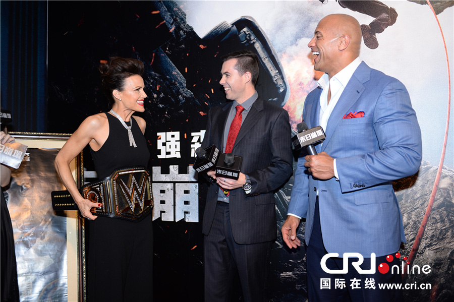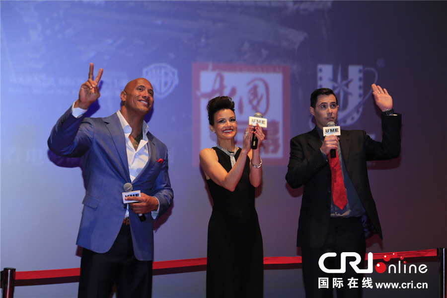 紅毯結(jié)束后,影城內(nèi)舉行了超前點映及映前見面會,三位主創(chuàng)親臨影城現(xiàn)場,與場內(nèi)影迷交流互動。提及將要上映的《末日崩塌》,導演佩頓、卡拉、強森各自分享了影片的臺前幕后花絮,并在現(xiàn)場提前解讀了影片的“震撼”視效和“家庭”特質(zhì)。卡拉談到:“在這樣一部宏大的災(zāi)難片中,很難得有走心的部分,無論即將離婚的夫妻情,還是牽動人心的父女情,以及母女情,都非常細膩動人?!蓖瑫r卡拉也不忘提醒在場觀眾:“看電影時一定記得喘氣,千萬別憋過去?!睆娚瓕τ谶@部電影則非常興奮和自信:“你們一定會愛死這部電影?!倍粏柤皠倓偟氖子臣t毯,強森表示,粉絲的數(shù)量之多和熱情之高給他留下了非常深刻的印象,導演佩頓更直呼:“這次中國之行,感覺太興奮,中國的粉絲太熱情了。”