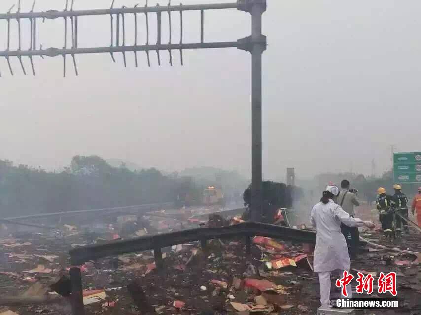 據(jù)江西省高速部門10月30日消息,當(dāng)日15:20左右,距離滬昆高速公路分宜互通2公里處發(fā)生油罐車爆炸事件,爆炸導(dǎo)致分宜收費(fèi)站內(nèi)辦公樓和宿舍大面積玻璃碎裂?,F(xiàn)場(chǎng)圖片顯示,有大量煙花爆竹燃燒痕跡。目前,江西省高速、交警、醫(yī)護(hù)、消防等相關(guān)部門已在現(xiàn)場(chǎng)。事故情況正在進(jìn)一步核實(shí)中,傷亡情況未知。(李琴 攝)