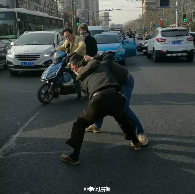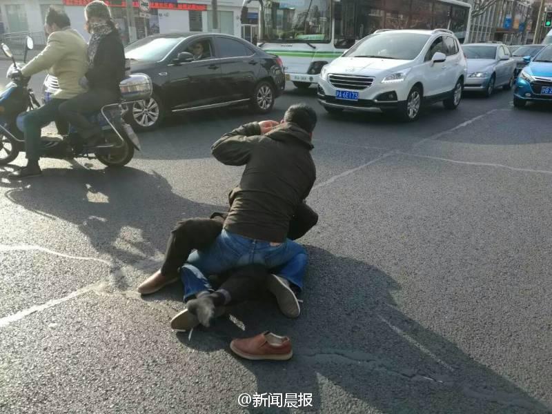 晨報(bào)訊 你一個(gè)過(guò)肩摔,我一個(gè)橫掃腿,接著扭打在一起,互相纏斗難分伯仲……這幕刺激的武打動(dòng)作場(chǎng)景,昨天早高峰時(shí)在上海安波路營(yíng)口路上演,而沖突竟源于“路怒”!目擊者肖先生告訴記者,昨天上午8點(diǎn)不到,他經(jīng)過(guò)安波路、營(yíng)口路路口時(shí),看看兩名男子扭打在一起,場(chǎng)面十分激烈?!拔翼槃?shì)拿出手機(jī)拍了幾張照片,旁邊也有行人上去勸架。”肖先生說(shuō),在兩名男子的身旁,一橫一豎停著兩輛轎車(chē),“我想可能是兩個(gè)人開(kāi)車(chē)有點(diǎn)摩擦引起的‘路怒’吧?!?/font>