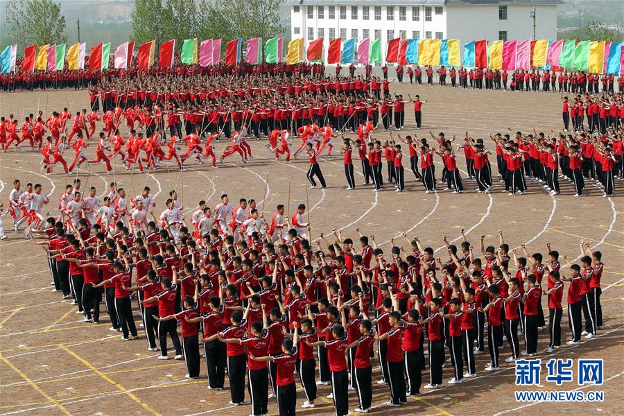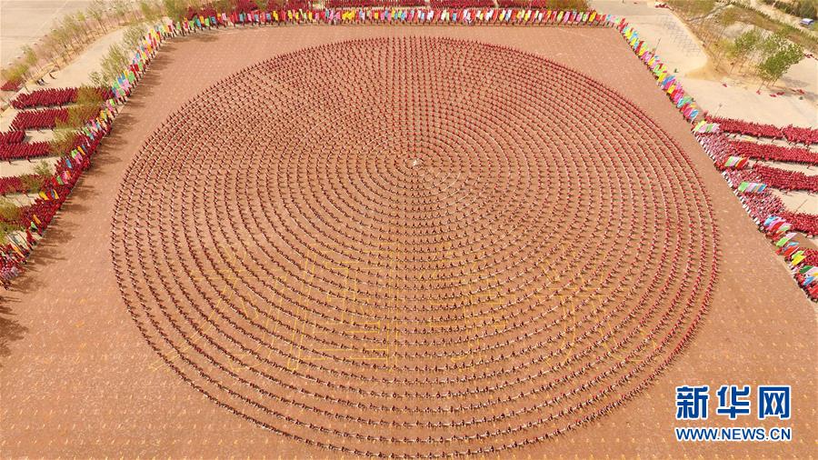 4月7日,在河南登封少林塔溝武術(shù)學(xué)校練功場,上課間操的學(xué)員擺出圓形圖案。當(dāng)日,河南登封少林塔溝武術(shù)學(xué)校2016年“春訓(xùn)”拉開帷幕,2.6萬名學(xué)員同上陣,進(jìn)行隊(duì)形變換、十八般兵器、少林硬氣功、少林集體棍等多種功法演練?!按河?xùn)”是少林塔溝武術(shù)學(xué)校每年春季開展的一項(xiàng)強(qiáng)化訓(xùn)練活動(dòng),旨在提升學(xué)員的耐力和競技狀態(tài)。新華社發(fā)(牛書培 攝)