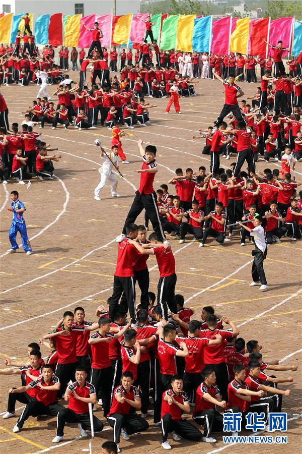 4月7日,在河南登封少林塔溝武術(shù)學(xué)校練功場,上課間操的學(xué)員疊起人塔。當(dāng)日,河南登封少林塔溝武術(shù)學(xué)校2016年“春訓(xùn)”拉開帷幕,2.6萬名學(xué)員同上陣,進(jìn)行隊(duì)形變換、十八般兵器、少林硬氣功、少林集體棍等多種功法演練?!按河?xùn)”是少林塔溝武術(shù)學(xué)校每年春季開展的一項(xiàng)強(qiáng)化訓(xùn)練活動(dòng),旨在提升學(xué)員的耐力和競技狀態(tài)。新華社發(fā)(牛書培 攝)
