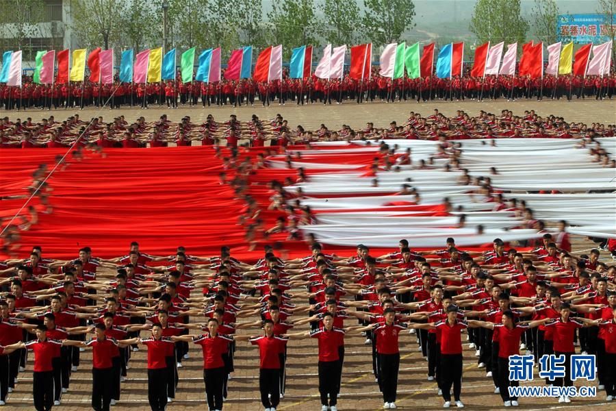 4月7日,在河南登封少林塔溝武術(shù)學(xué)校練功場,上課間操的學(xué)員進(jìn)行隊(duì)形變換。當(dāng)日,河南登封少林塔溝武術(shù)學(xué)校2016年“春訓(xùn)”拉開帷幕,2.6萬名學(xué)員同上陣,進(jìn)行隊(duì)形變換、十八般兵器、少林硬氣功、少林集體棍等多種功法演練?!按河?xùn)”是少林塔溝武術(shù)學(xué)校每年春季開展的一項(xiàng)強(qiáng)化訓(xùn)練活動(dòng),旨在提升學(xué)員的耐力和競技狀態(tài)。新華社發(fā)(牛書培 攝)