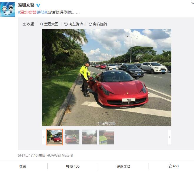 深圳交警5月7日17:16發(fā)布了一條微博:“當鐵騎遇到他……”,同時配上四張圖片:只見一輛掛著“NB”車牌的紅色跑車被交警鐵騎攔下,最后被帶走。