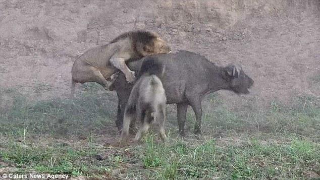 突然,兩群獅子開始內訌,一只母獅子攻擊了一只不屬于自己群體的公獅子,試圖阻止它享用水牛。