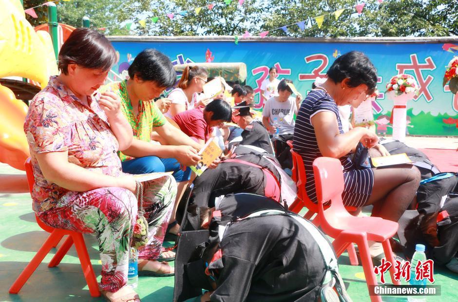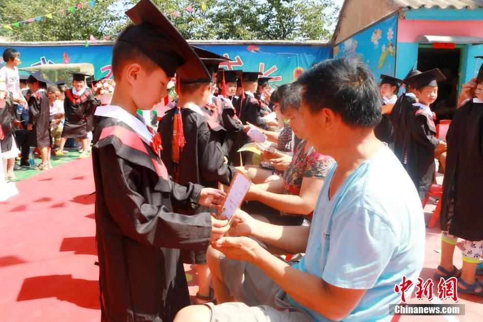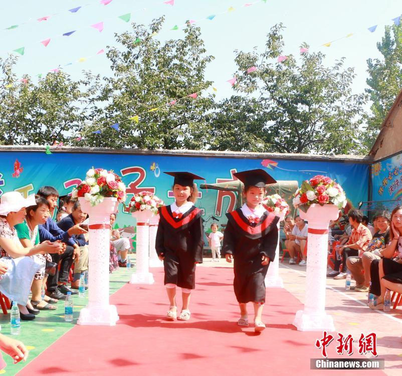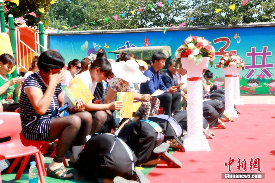 又到一年畢業(yè)季,6月20日,河南商水縣鄧城鎮(zhèn)留守兒童幼兒園60名孩子迎來了一場特殊的畢業(yè)典禮。孩子們身穿迷你學(xué)士服,自信地走紅毯、拋學(xué)士帽。在跪謝父母養(yǎng)育之恩的環(huán)節(jié),因?yàn)榇蟛糠趾⒆邮橇羰貎和?,孩子們只能跪謝爺爺奶奶的照顧,許多家長在現(xiàn)場感動(dòng)落淚。葉青 攝