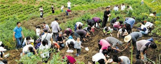 昨天,記者驅(qū)車(chē)來(lái)到了這個(gè)幾乎是磐安縣最東面的偏遠(yuǎn)鄉(xiāng)鎮(zhèn)胡宅,事實(shí)上,后張村就處于磐安和新昌交界的地方。中午時(shí)候,這個(gè)人口上千的村落幾乎已經(jīng)被各種各樣的車(chē)子停滿了,有奔馳越野車(chē),也有面包車(chē)和電瓶車(chē),有浙G、浙D、浙A等省內(nèi)牌照的,也有皖N的。這里的山頭傳說(shuō)是死火山形成,所以土壤肥沃,幾乎整塊都被犁出來(lái),種上莊稼,最多的是茶樹(shù)。一眼望去,尋寶的人員估計(jì)有六七百人,有人在挖,也有人是在圍觀。村民說(shuō),來(lái)來(lái)回回,當(dāng)天起碼涌進(jìn)來(lái)上千人在尋寶。