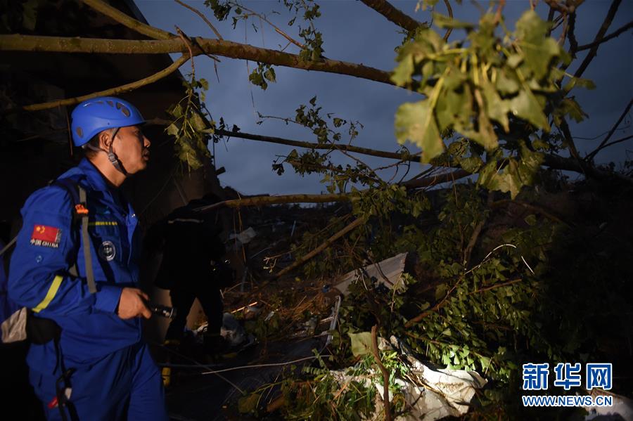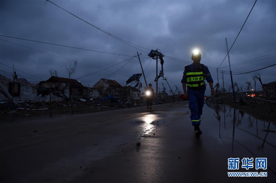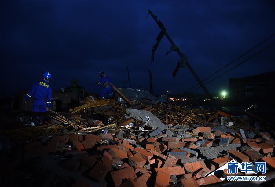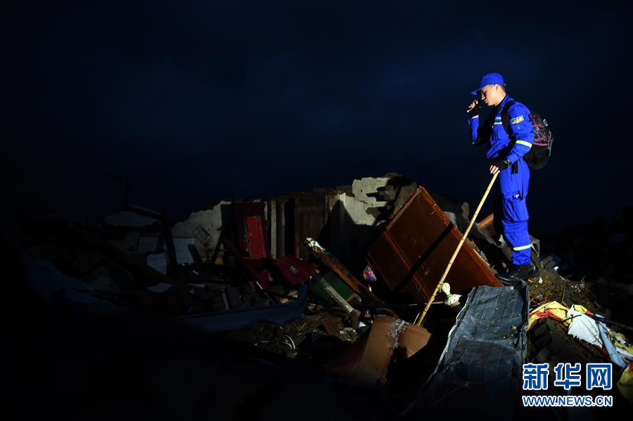 6月24日黎明,搜救人員在鹽城市阜寧經(jīng)濟(jì)開發(fā)區(qū)北陳村進(jìn)行排查搜救。新華社記者李響攝