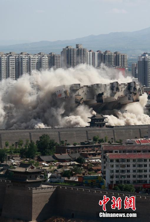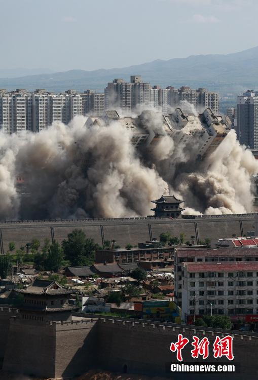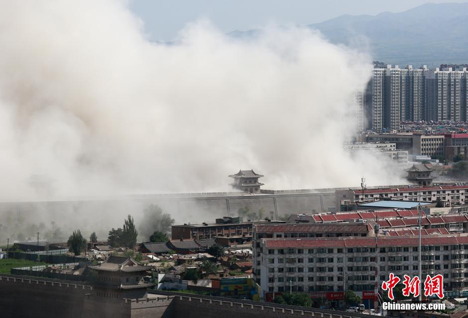 8月8日,山西大同,當(dāng)?shù)卣畬?duì)位于北城墻武定西門(mén)外的一座90米高的大樓實(shí)施爆破拆除,飛揚(yáng)的塵土與古城墻呼應(yīng)形成壯觀場(chǎng)面。由于該樓位置與古城保護(hù)規(guī)劃有所沖突,當(dāng)?shù)卣畬?duì)其實(shí)施爆破,以此加快古城的保護(hù)與復(fù)興。 楊榮 攝