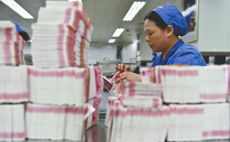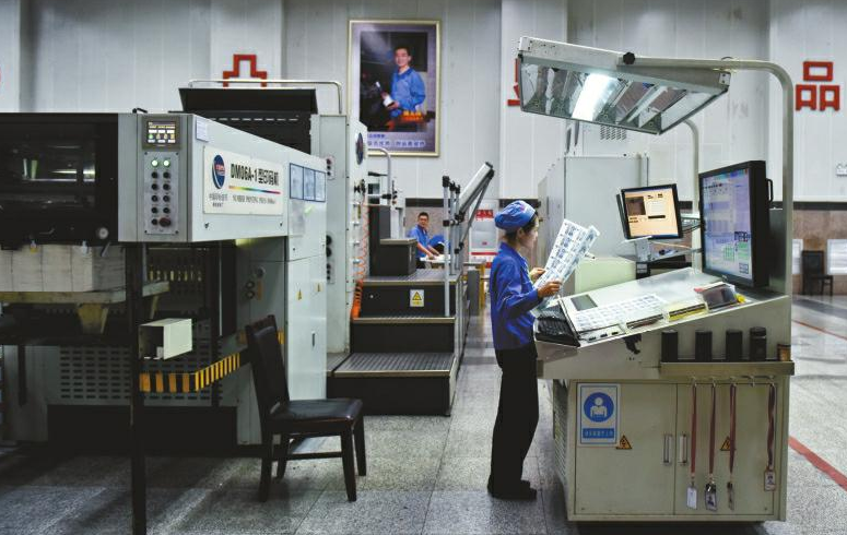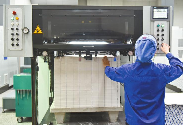成鈔公司大門(mén)口,緊握槍支的武警駐守,在這里,有著嚴(yán)密的安檢措施。在經(jīng)過(guò)層層申報(bào)審批,暫存隨身攜帶的手包和手機(jī)后,記者獲批進(jìn)入生產(chǎn)車(chē)間。瞬間,靜謐被機(jī)器的轟鳴代替。在車(chē)間內(nèi),穿著藍(lán)色工裝的工人正有序忙碌著。在這里經(jīng)過(guò)多道印鈔工序及干燥、檢驗(yàn)等環(huán)節(jié)后,一張張雪白的印鈔紙“搖身一變”,成為紅紅綠綠的鈔票,整個(gè)過(guò)程前后需要耗時(shí)1個(gè)月左右。