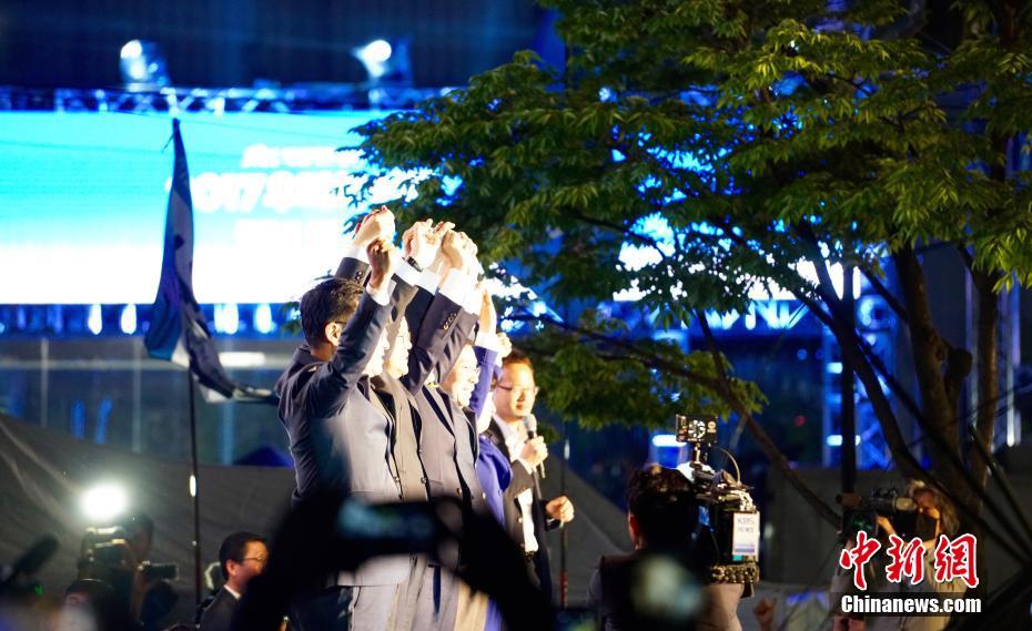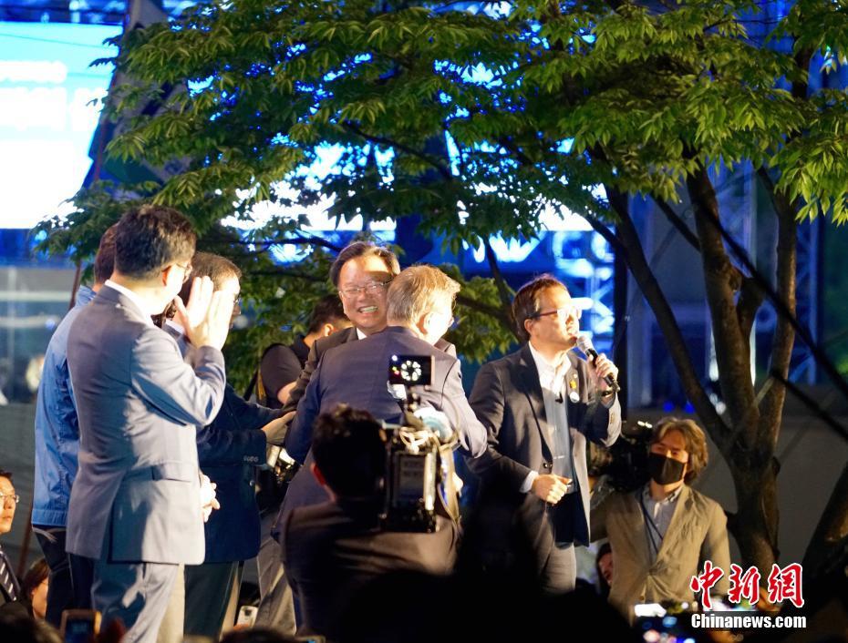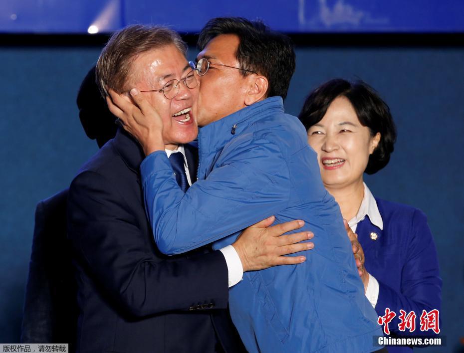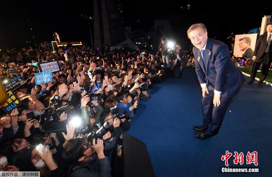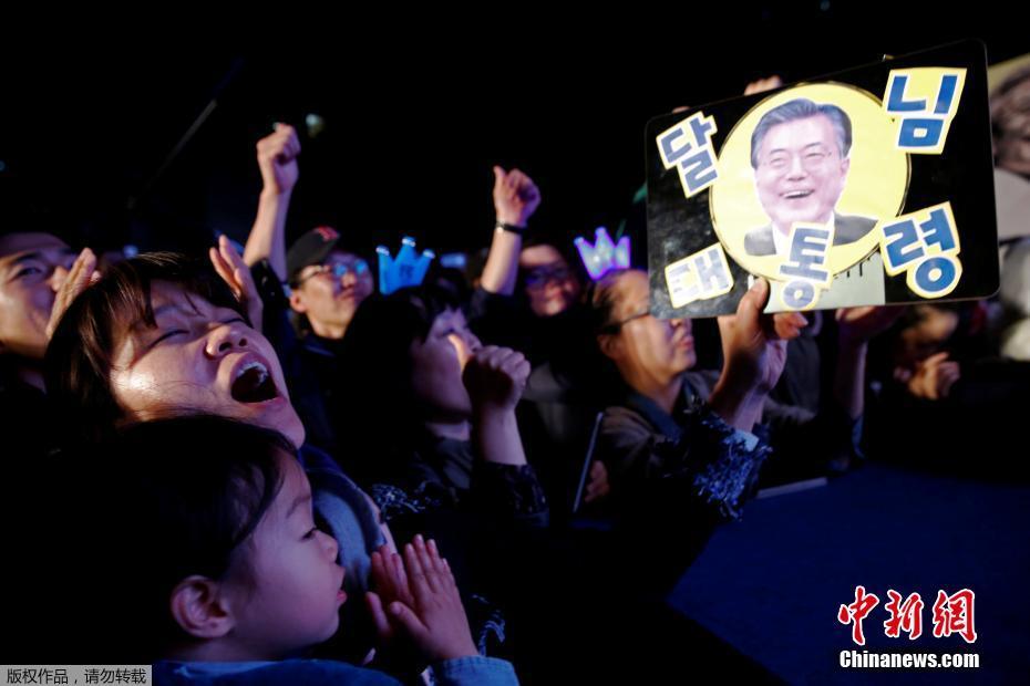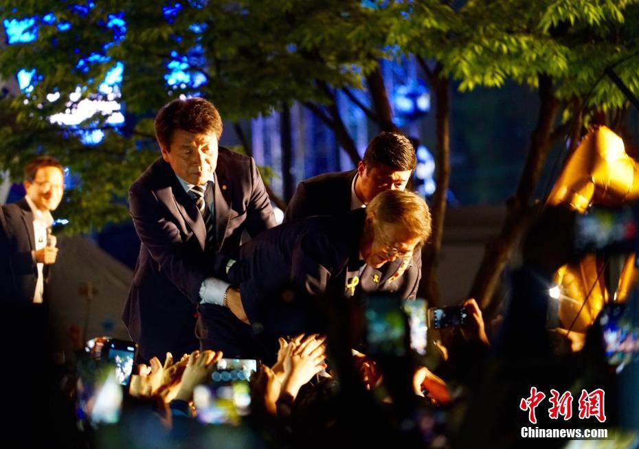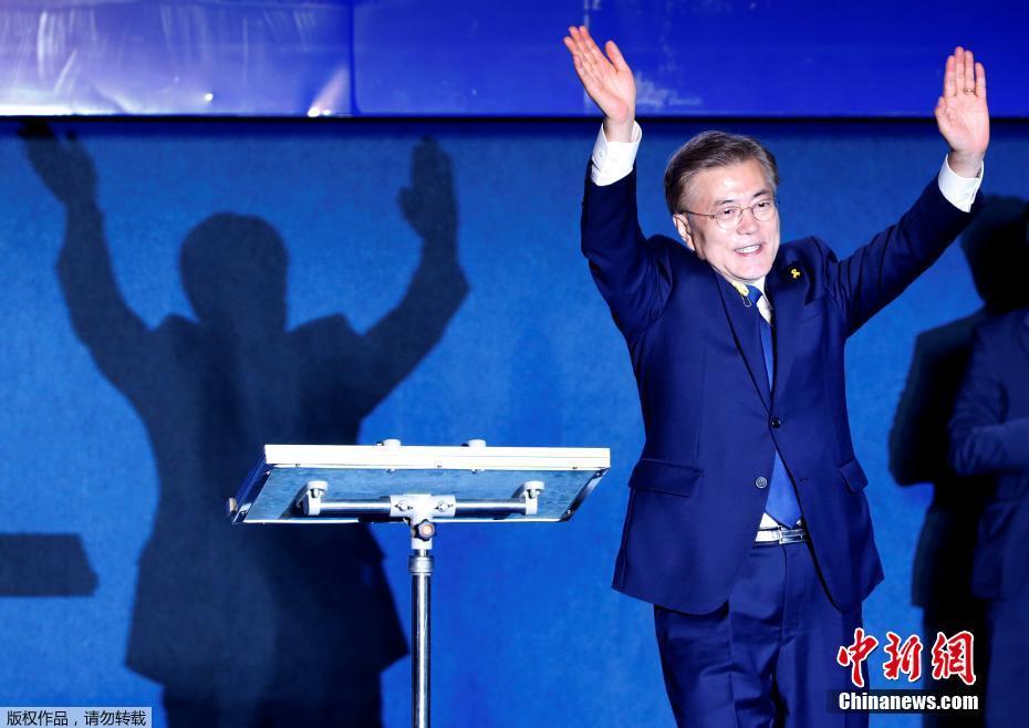 當?shù)貢r間5月9日深夜,韓國第19屆總統(tǒng)選舉共同民主黨候選人文在寅及其競選團隊現(xiàn)身首爾光化門廣場,發(fā)表“勝選演說”,與支持民眾握手慶祝。據(jù)出口民調顯示,文在寅在當日進行的大選投票中以41.4%的支持率絕對優(yōu)勢勝選。在選舉管理委員會公布的大部分開票結果中,文在寅得票率也遙遙領先,提前鎖定勝局。 中新社記者 吳旭 攝