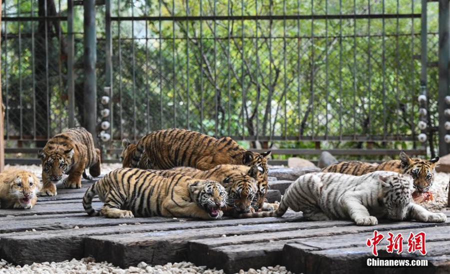 10月17日,濟南野生動物世界2017年誕生的12只小老虎集中亮相,霸氣模樣吸引許多游客駐足觀賞。據(jù)悉,濟南野生動物園2017年共繁育成活26只小老虎,其中2只是“虎中極品”金虎。 中新社記者 張勇 攝