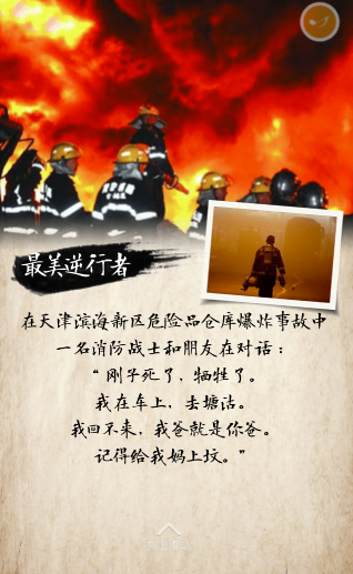 在天津?yàn)I海新區(qū)危險(xiǎn)品倉(cāng)庫(kù)爆炸事故中,一名消防戰(zhàn)士和朋友在對(duì)話:“剛子死了,犧牲了。我在車(chē)上,去塘沽。我回不來(lái),我爸就是你爸。記得給我媽上墳。”