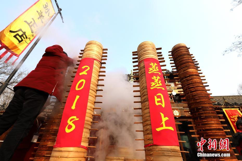 2018年1月1日,河南開封清明上河園孫羊正店門前,現(xiàn)場(chǎng)高高疊起的小籠包熱氣騰騰,小籠包上喜慶的紅字寫著“2018”“蒸蒸日上”?!八位兆凇睅ьI(lǐng)“后宮佳麗”為游客免費(fèi)發(fā)放剛剛蒸好的小籠包,寓意新的一年“蒸蒸日上”,吸引數(shù)千名游客爭(zhēng)相品嘗求好運(yùn)。據(jù)清明上河園市場(chǎng)部石經(jīng)理介紹,為了給游客送上這份新年祝福,清明上河園啟用了多個(gè)地方一起蒸小籠包,當(dāng)天共準(zhǔn)備了2018籠開封名吃“灌湯包”,在多個(gè)發(fā)放點(diǎn)陸續(xù)為民眾送上新年的“免費(fèi)午餐”,祝愿大家都能夠在新的一年里“蒸蒸日上”。中新社記者 王中舉 攝