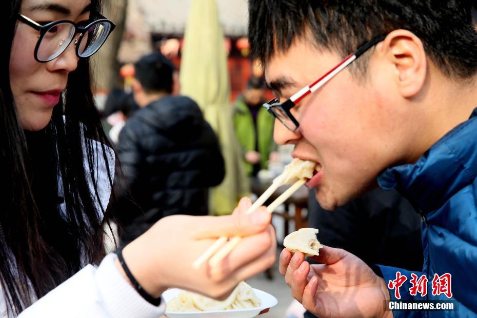 2018年1月1日,河南開封清明上河園孫羊正店門前,現(xiàn)場(chǎng)高高疊起的小籠包熱氣騰騰,小籠包上喜慶的紅字寫著“2018”“蒸蒸日上”。“宋徽宗”帶領(lǐng)“后宮佳麗”為游客免費(fèi)發(fā)放剛剛蒸好的小籠包,寓意新的一年“蒸蒸日上”,吸引數(shù)千名游客爭(zhēng)相品嘗求好運(yùn)。據(jù)清明上河園市場(chǎng)部石經(jīng)理介紹,為了給游客送上這份新年祝福,清明上河園啟用了多個(gè)地方一起蒸小籠包,當(dāng)天共準(zhǔn)備了2018籠開封名吃“灌湯包”,在多個(gè)發(fā)放點(diǎn)陸續(xù)為民眾送上新年的“免費(fèi)午餐”,祝愿大家都能夠在新的一年里“蒸蒸日上”。中新社記者 王中舉 攝