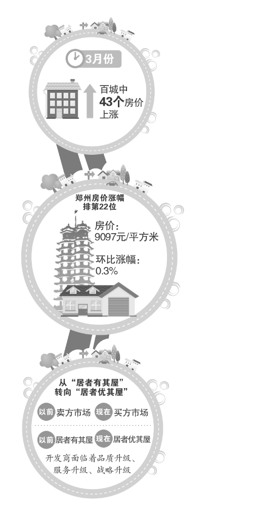 中國指數(shù)研究院昨日發(fā)布的百城房價指數(shù)顯示,3月份,100個城市中有43個房價上漲,全國房價環(huán)比整體跌幅收窄,微跌0.15%,同比跌幅繼續(xù)擴(kuò)大,下跌4.35%。其中,鄭州3月份新建商住房均價為9097元/平方米,環(huán)比上漲0.3%,漲幅在全國排到第22位。