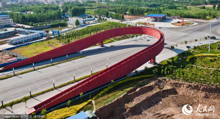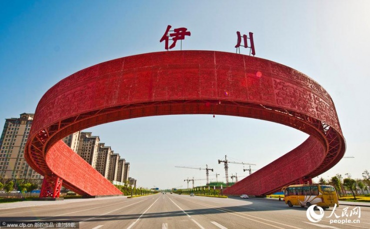 洛陽市伊川縣洛伊快速通道伊川界的伊川北大門建成,設計雷人,既像是一條紅腰帶,又酷似一個圈套,遭到網友虐稱:進出城要鉆“褲腰帶”。