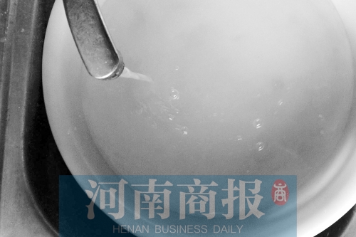 進(jìn)入一居民家后,居民迫不及待地打開水龍頭。河南商報記者看到,剛從水龍頭里接出來的水確實像面湯一樣白稠,放置半分鐘后,水開始變清,再過一段時間,接水盆盆底開始顯現(xiàn)出一層紅色的沙子。