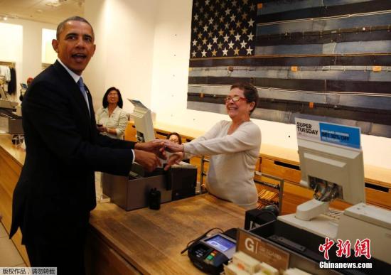 資料圖:當(dāng)?shù)貢r間2014年3月11日,美國紐約,美國總統(tǒng)奧巴馬在服裝商店中為妻女選購衣物。
