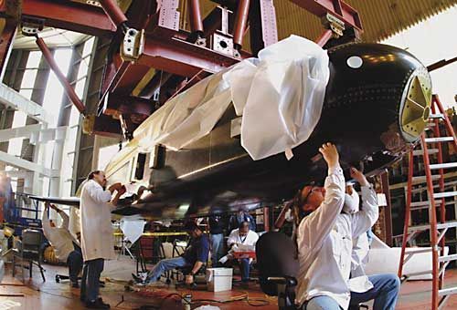 正在制造中的X-37B。X-37太空飛機(jī),也簡(jiǎn)稱為“X-37”,是美國國防部與宇航局共同制定的“FALCON”計(jì)劃、為實(shí)現(xiàn)“快速全球打擊”的構(gòu)想而研制的一種空天飛機(jī)。這種空天飛機(jī)在兩小時(shí)內(nèi)可攻擊地球上任意一個(gè)目標(biāo)?!癤-37”太空飛機(jī)是“FALCON”項(xiàng)目中的第一個(gè)預(yù)研型號(hào),是與微型航天飛機(jī)相似的飛行器。它將驗(yàn)證NASA軌道太空飛機(jī)項(xiàng)目中25項(xiàng)創(chuàng)新的航天技術(shù)。