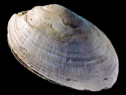這個(gè)距今約50萬年歷史的貝殼化石上,出現(xiàn)了人工雕刻的痕跡