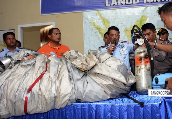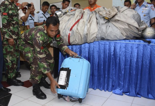 當地時間12月30日,印尼官方展示被打撈上來的客機殘骸以及乘客遺物。AP Photo/Dewi Nurcahyani