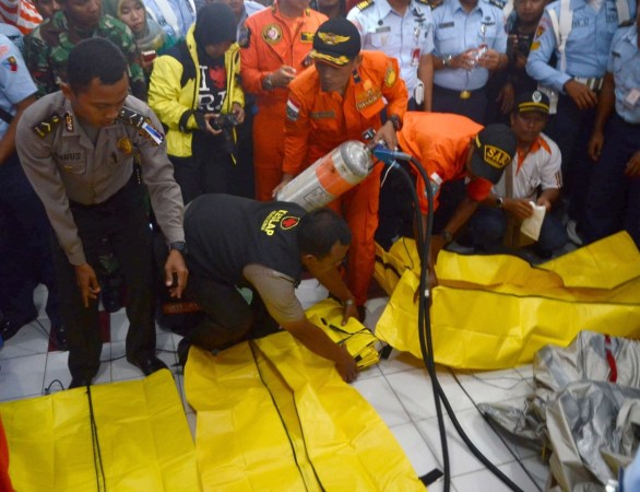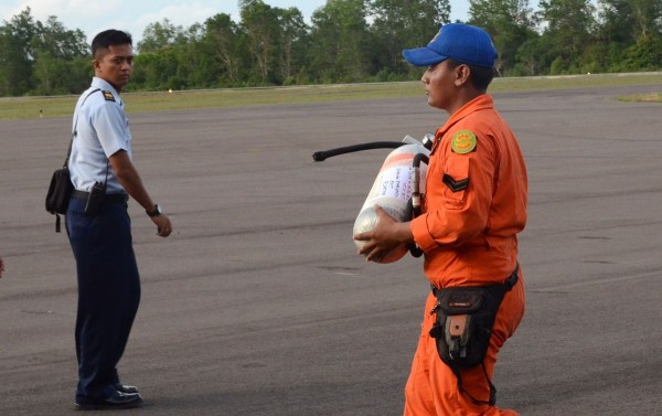 當地時間2014年12月30日,印尼龐卡蘭布翁,印尼搜救部隊準備尸袋前往飛機失事地點打撈殘骸和遺體。