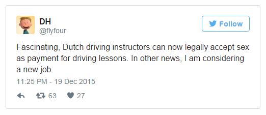 據荷蘭新聞(Dutchnews)網站12月14日報道了該國議會一件令人震驚的決議——駕校教練可以用性回報代替現金來收費。這一消息引起媒體大嘩,大約一周后(21日),各國媒體議論紛紛。赫芬頓郵報的副標題就是“Ride for a ride”意為可以用性來換一段路程,CNN報道稱:“Go Dutch”現在有了新的意味,因為歐洲男性開始涌向荷蘭,遞交擔任駕校教練申請。根據荷蘭政府方面的消息,申請量比之前增加了5倍。