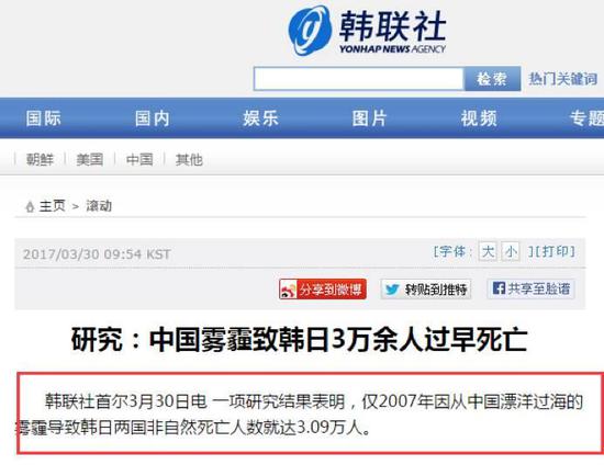 韓聯社是這樣說的,一項研究結果證明,從中國漂洋過海的霧霾導致了韓日兩國有3萬余人過早死亡, 并配上了一幅悲情的“霧霾圖”。