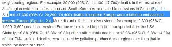 其中提到的很多地區(qū)的死亡數值都很高,比如,東歐地區(qū)有47300人的非正常死亡同西歐的大氣污染物排放有關,然而此類內容卻沒有出現在韓聯社的報道內容中。