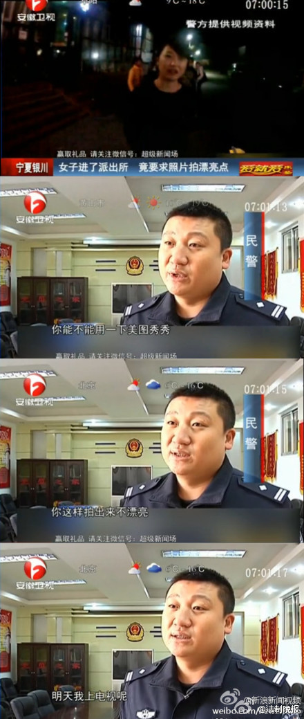 人民網(wǎng)北京11月4日電 據(jù)寧夏回族自治區(qū)公安廳官方微博消息,日前,寧夏銀川,一名女子因搶奪執(zhí)法記錄儀,阻撓執(zhí)法被警察帶走。民警在審訊室準(zhǔn)備對其拍照時,女子竟然要求民警用美圖軟件,聲稱:“你這樣拍出來不漂亮,明天我上電視吶?!?/p>