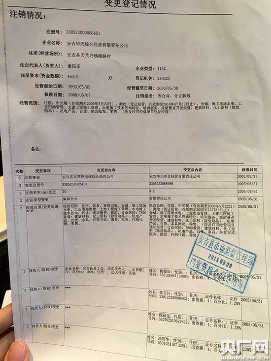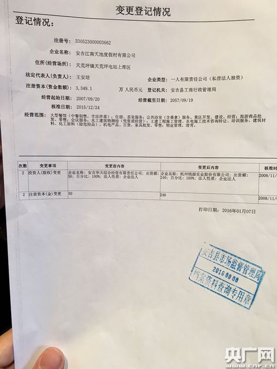 記者查詢安吉縣工商局登記信息發(fā)現(xiàn),江南天池度假村的前身就是天荒坪電站的三產(chǎn),天荒坪電站綜合經(jīng)營公司,在2005年前屬于集體企業(yè),之后這家企業(yè)多次變身,成為了浙江錢源旅游開發(fā)股份有限公司,江南天池公司就是錢源的全資子公司,2010年后,兩家企業(yè)的法人代表變?yōu)殡娬厩肮?huì)主席王安培。