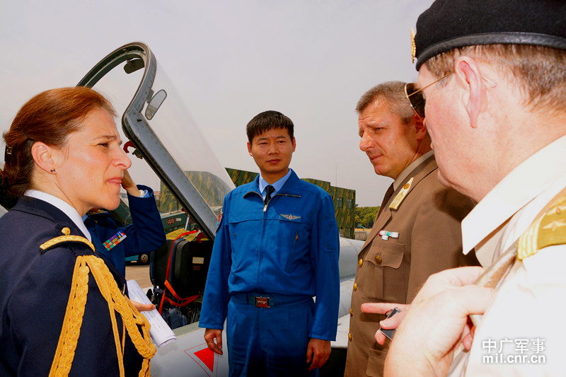 “飛豹雄獅”飛行大隊(duì)長(zhǎng)劉杰向駐華武官介紹“飛豹”戰(zhàn)機(jī)