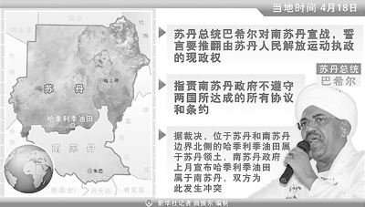 卡塔爾半島電視臺(tái)19日援引蘇丹官方通訊社的消息說,蘇丹總統(tǒng)巴希爾當(dāng)天在北科爾多凡州首府歐拜伊德的群眾集會(huì)上發(fā)表講話,稱只有用大棒才能懲罰南蘇丹,蘇丹將通過軍事手段解放南蘇丹。