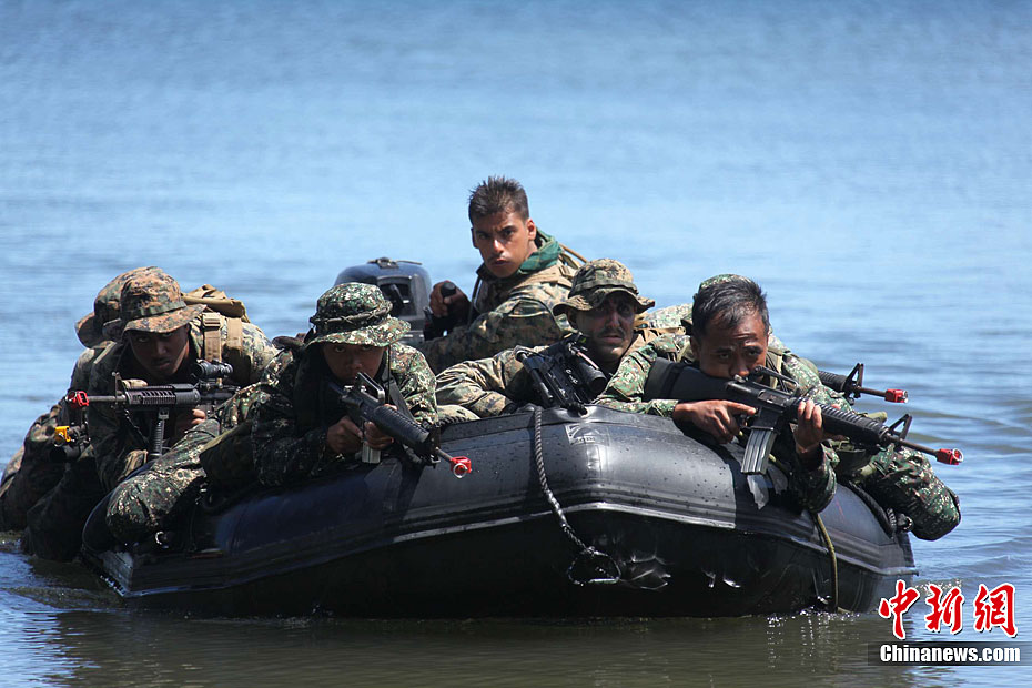4月25日,美國與菲律賓“肩并肩2012”聯(lián)合軍演參演部隊(duì)在菲律賓南部巴拉望省普林塞薩港市的阿魯甘灣舉行“兩棲登陸”演練,美菲雙方近百名海軍陸戰(zhàn)隊(duì)士兵參加。這也是美菲“肩并肩2012”聯(lián)合軍演開幕10天以來,開放媒體采訪規(guī)模最大的一場軍事演習(xí)活動。圖為美菲海軍陸戰(zhàn)隊(duì)士兵混合編隊(duì),搭乘小艇抵達(dá)演習(xí)地點(diǎn)。張明 攝