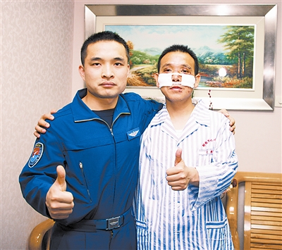 9時(shí)16分,飛機(jī)降落在跑道上,早已等候在停機(jī)坪上的官兵沖了上去。經(jīng)診斷,張建興面部裂傷7處,頭、面部大面積挫傷,傷口最長達(dá)6厘米,深達(dá)顴骨,并有骨質(zhì)暴露,面部需縫合30余針。